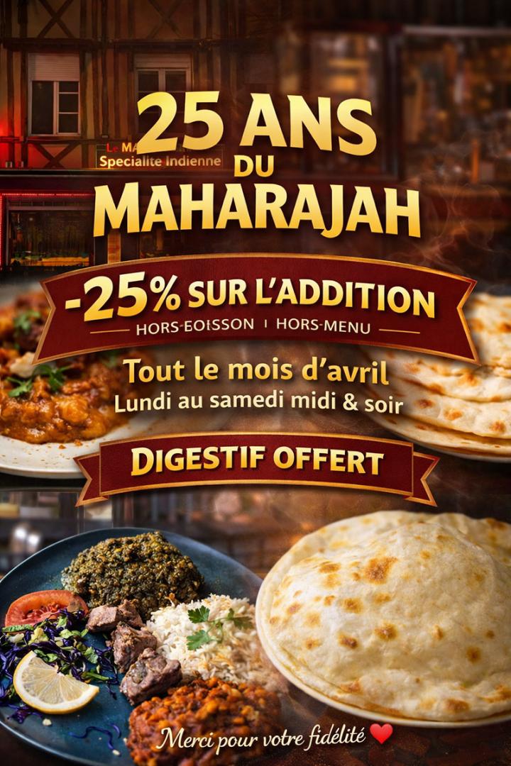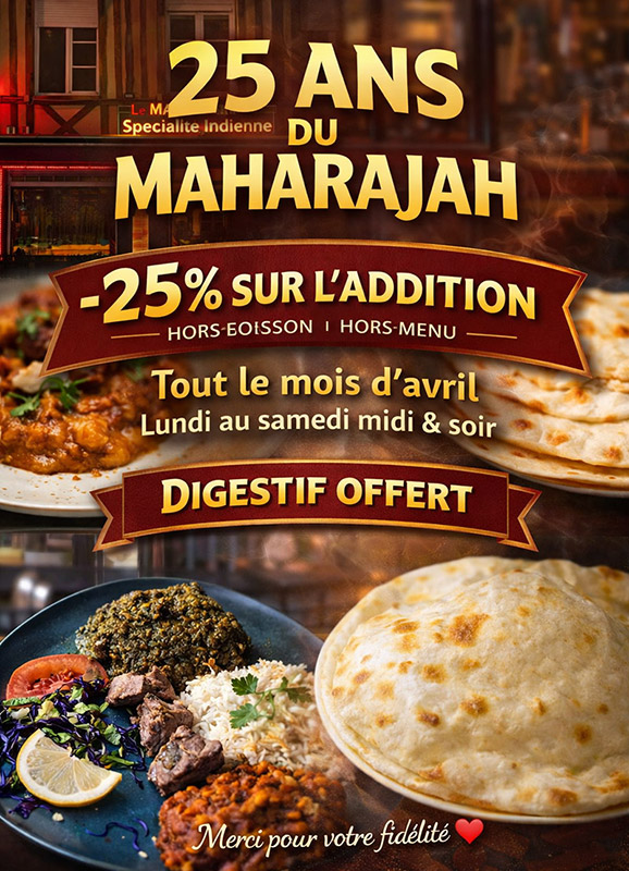 Vous avez envie de vous délecter de bons plats indiens ? Le restaurant Le Maharajah, situé dans le département de l’Eure (27), vous propose ses spécialités traditionnelles indiennes. Nous vous proposons une grande variété de saveurs idéales pour toutes les occasions. Nous faisons la livraison autour de 5 km d'Évreux